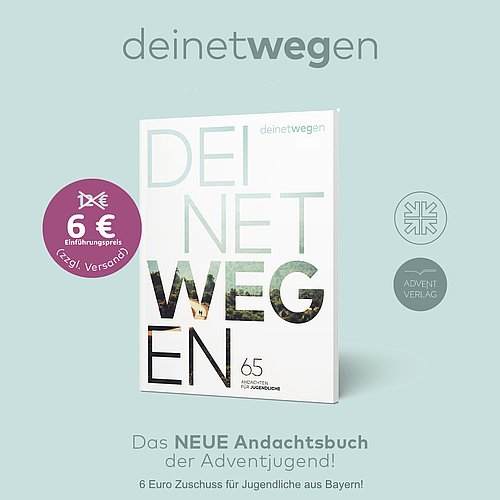 Bis Ende Juli bekommst du dieses tolle Andachtsbuch zu einem Sonderpreis von nur 6 Euro (zzgl. Versandkosten). Den Rest bekommst du von deiner Adventjugend Bayern geschenkt. Um dein Buch rabattiert zu bestellen, folge diesem Link: